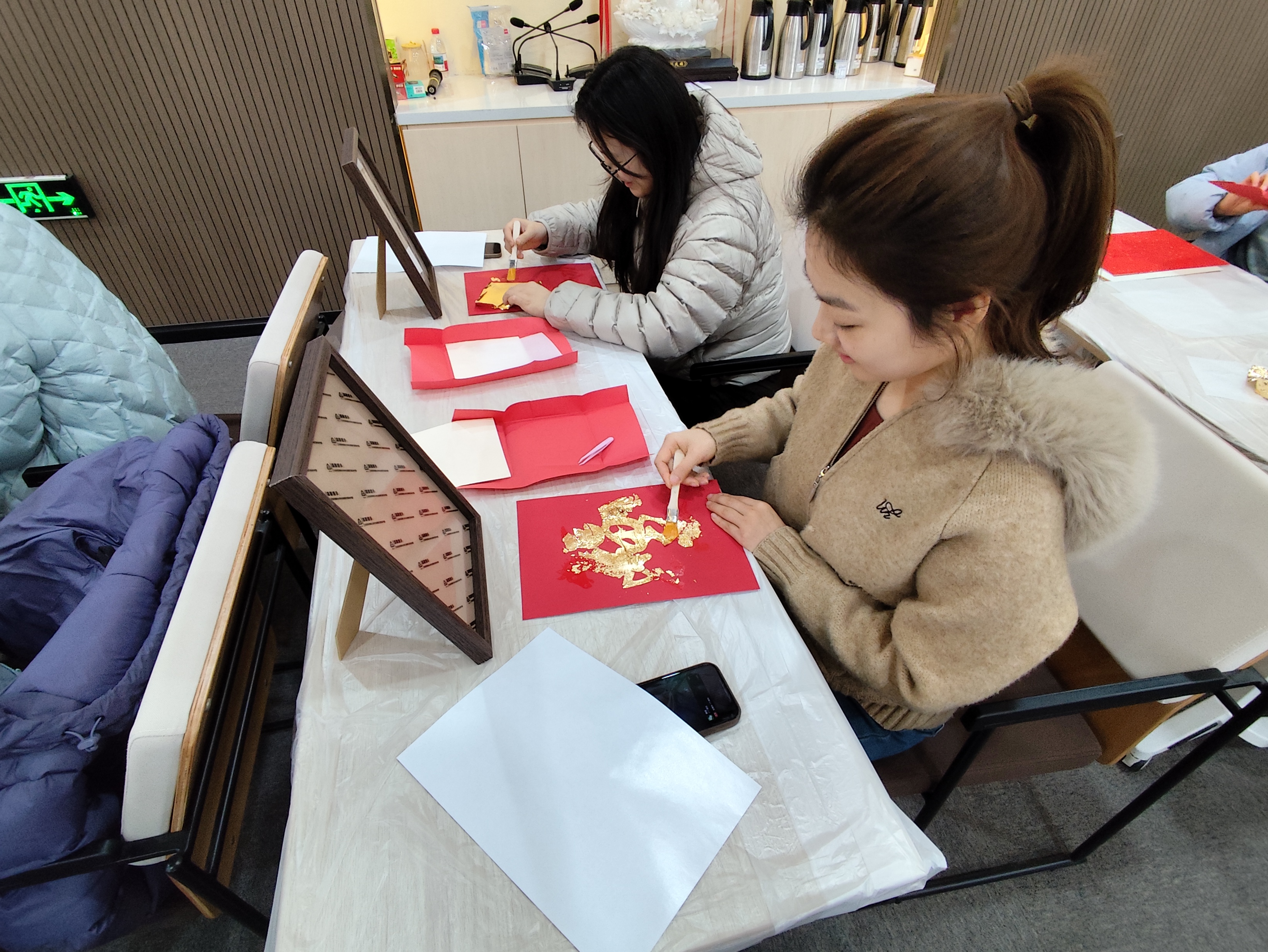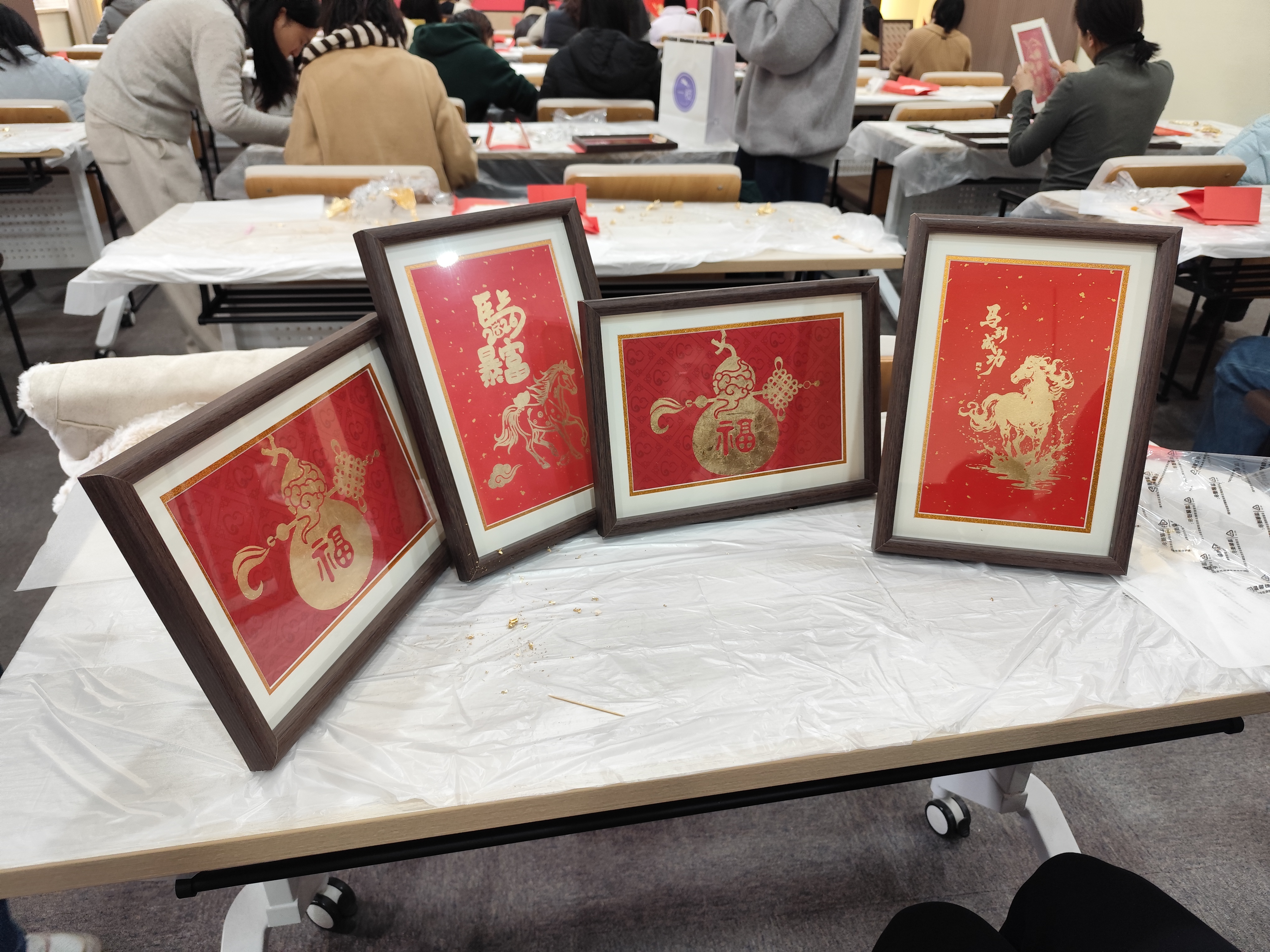 实操环节,老师们化身“金箔匠人”。贴金、扫箔、装框,金屑飞扬间,一幅幅金箔画陆续完工,“柿柿如意”“马到成功”“马上有福”等跃然纸上,金辉与笑靥交相辉映。